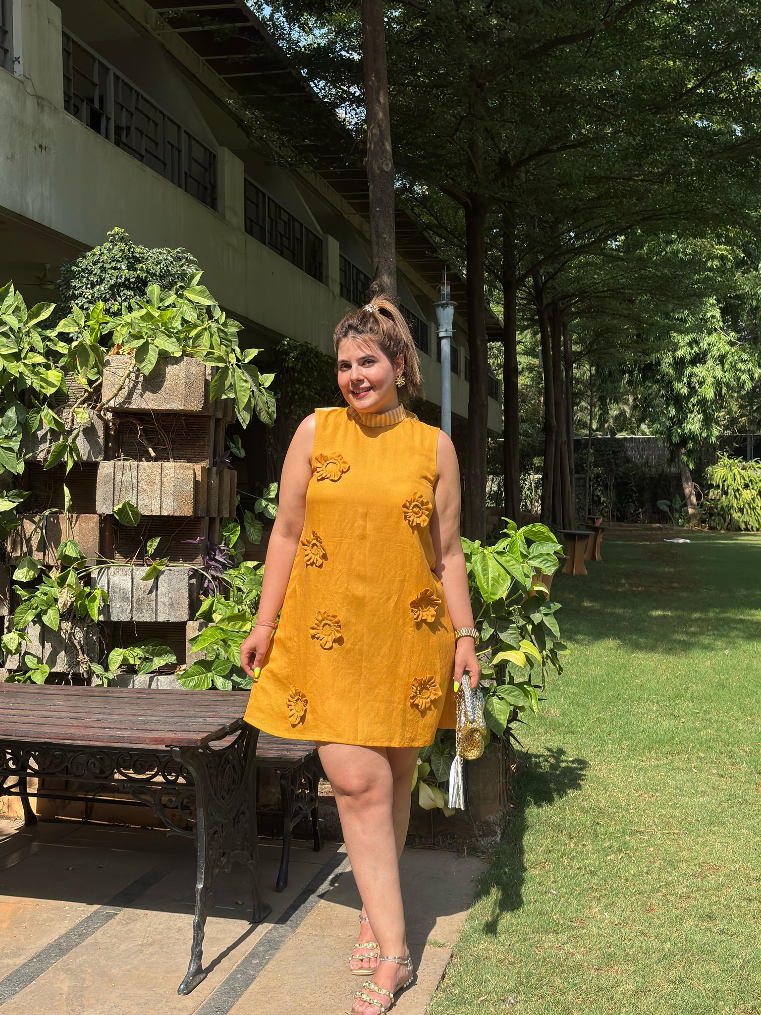 - 3d flower detailing on front using left over fabric scraps to reduce fabric waste and striped fabric tie up at back.
